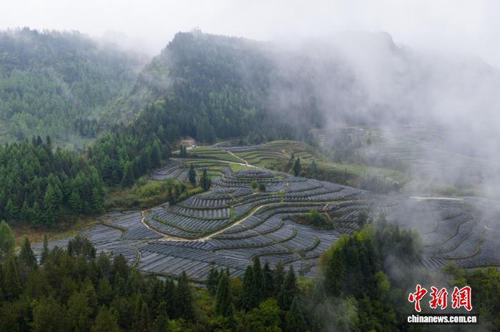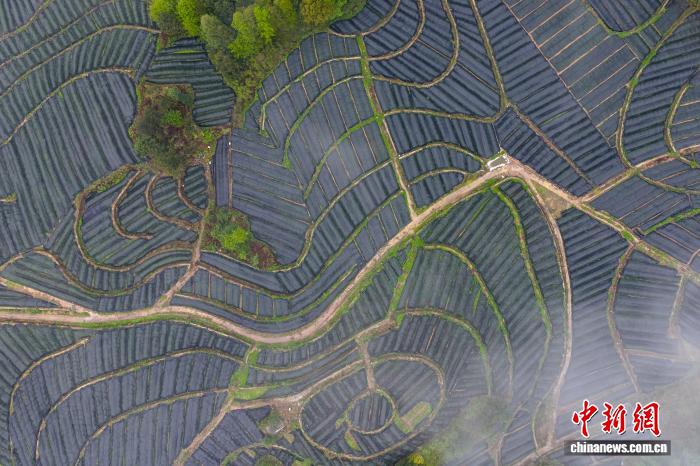 4月14日,航拍沉庆石柱县6塘城黄连GAP树模培植基天,连片的黄连依山便势展睁开去,正在云雾旋绕间出现出奇特的平地农业景不雅。中新社记者 何蓬磊 摄