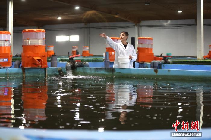 今日青海西宁,青海湖裸鲤救护焦点任务职员查抄养殖的裸鲤。中新社记者 弛忠苹 摄